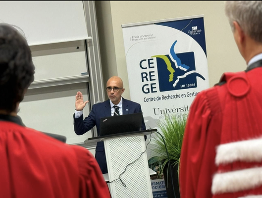 Jury en cotutelle composé de Vincent Meyer (Professeur à l’Université Côte d’Azur, directeur de thèse), Souad Kamoun-Chouk (MCF HDR, École Supérieure de Commerce de Tunis, Université de la Manouba, co-directrice de thèse), Annick Schott, (MCF HDR, Université Bordeaux Montaigne, rapporteur), Hafedh Ben Abdennebi, (Professeur à l’Institut des Hautes Études Commerciale, Université de Carthage, président), Belgacem Bchini, (MCF HDR, Institut Supérieur de Gestion, Université de Tunis, rapporteur), Université Côte d’Azur, Nice, le 4 juillet. Mention très honorable de l’université de la Manouba en Tunisie.